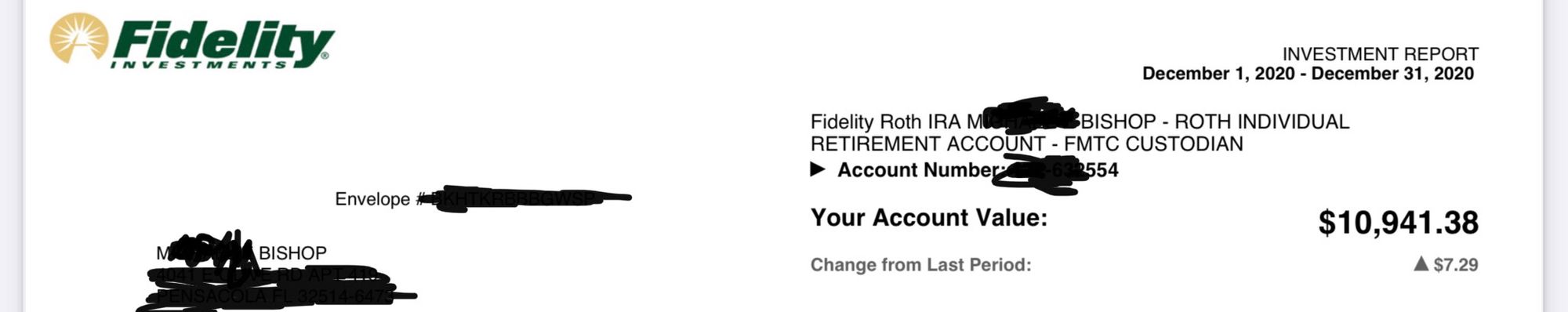 The first account that I’m using for my journey in this newsletter is with Fidelity. I moved some money out of it last year and was planning to get it down to exactly $10,000 for the end of year balance, however, I inadvertently left about $900 extra. The 2020 end of year balance was $10,941.38, so that becomes the beginning balance for my mutual fund FIRE portfolio. Below is a screenshot of a portion of my end of year statement.