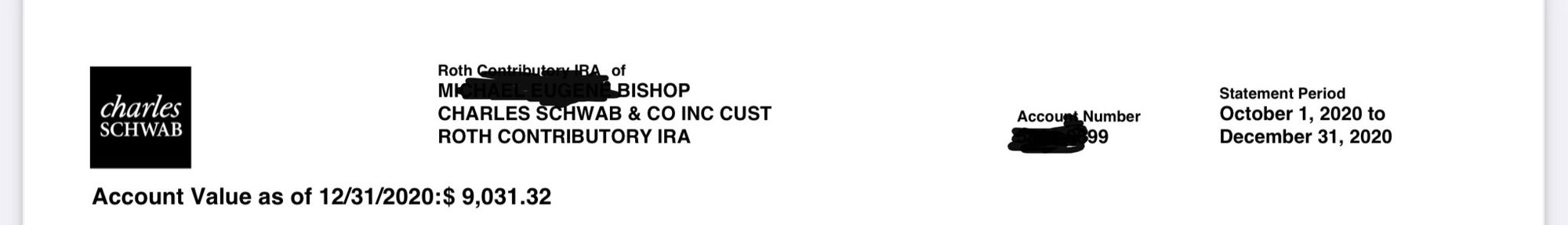 This ETF portfolio account is at Charles Schwab. Charles Schwab is an excellent brokerage also consistently rated very highly by industry experts. My 2020 end of year balance in this account was $9,031.32, so that becomes the beginning balance for my ETF FIRE portfolio. Here is a screenshot of my end of year statement.